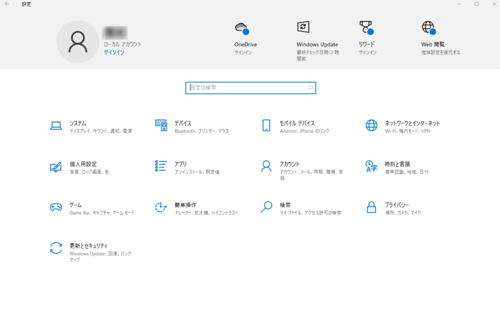 ①「Windows」キー+「I」キーを同時押し、設定画面を開きます