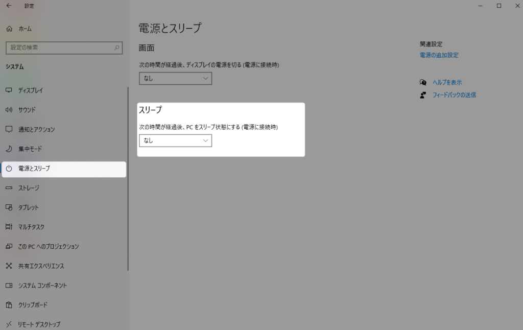 ③「電源とスリープ」をクリックし、”スリープ”の「次の時間が経過後、PCをスリープ状態にする」を選択し、「なし」を選んで設定してください。