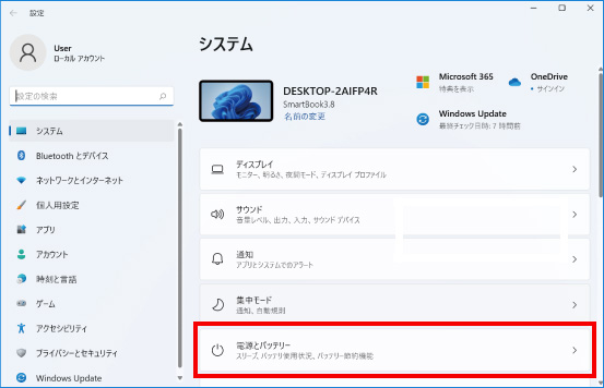 ①「Windows」キー+「I」キーを同時押し、設定画面を開いて「電源とバッテリー」をクリックします。