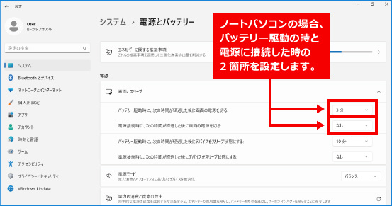 ※画像引用「パソコンサポート|画面が自動的に消える時間を変更する方法(スリープ設定・画面の電源オフ設定)」より