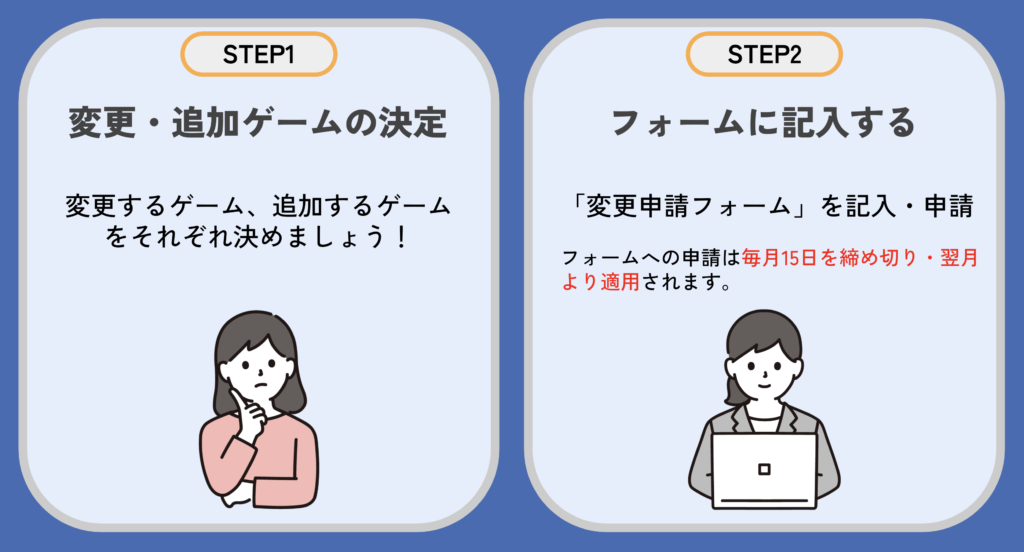 (例:4月1日からゲームを変更して新しいゲームを導入したい場合は、3月15日までに変更申請フォームをご提出ください。)