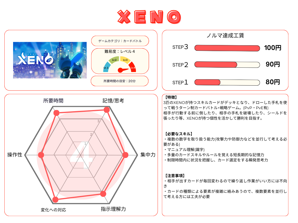 3匹のXENOが持つスキルカードがデッキとなり、ドローした手札を使って戦うターン制カードバトル×戦略ゲーム。(PvP・PvE有)